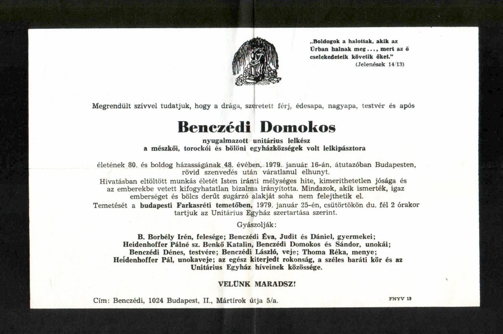 Benczédi Domokos 1899. Benczéd - 1979. Budapest Unitárius lelkész: |